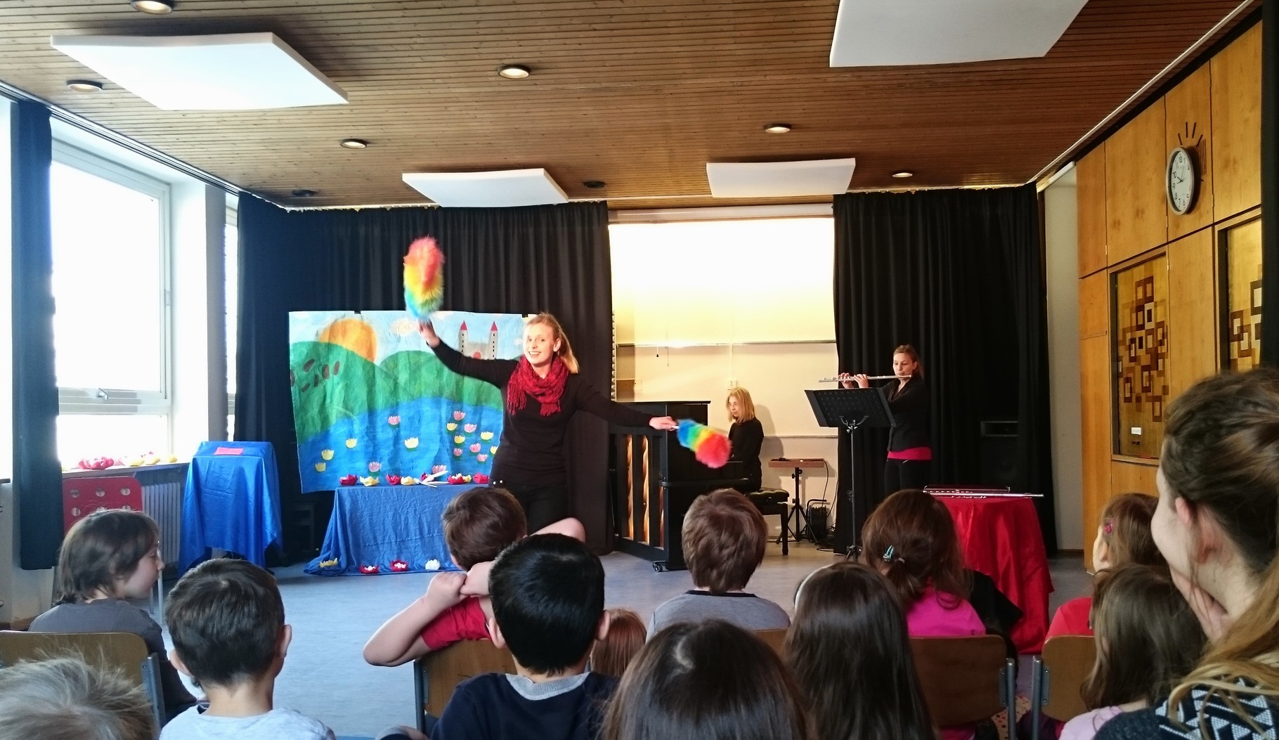 Die Musiker geben Silberklänge und Tastenmusik zum Besten und entführen die Kinder in eine kunterbunte Klangreise, die zum gemeinsamen Singen und Musizieren einlädt.