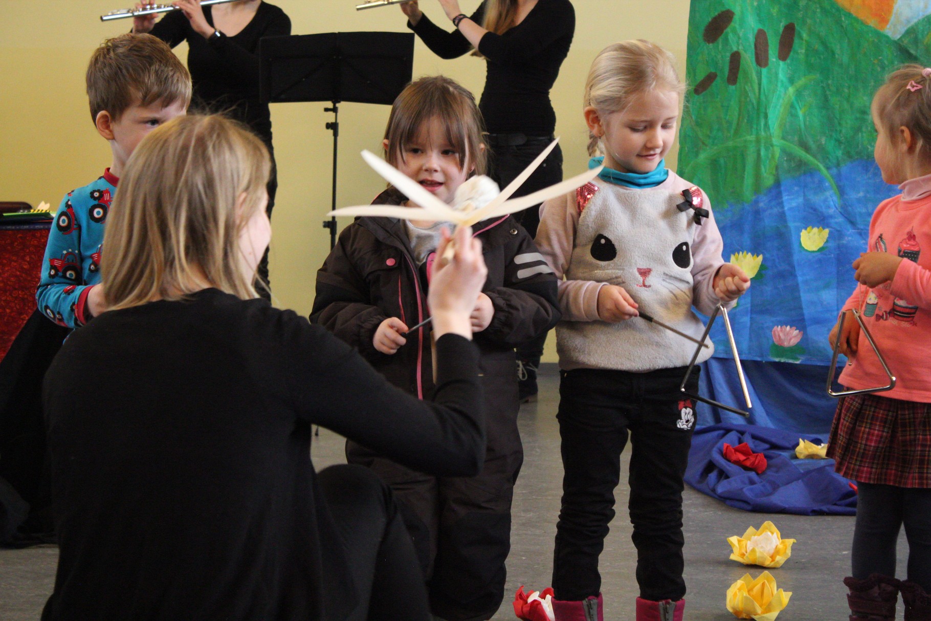 Einzelne Kinder spielen zur Musik mit lang klingenden Instrumenten, nachdem sie von einer Libellenfigur angestupst wurden.